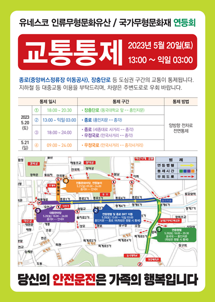 5월 20일~21일 연등회 행사 기간 동안 종로, 장충단로 등 일부 구간 교통이 통제됩니다. 지하철과 버스등의 이용을 권하며, 부득이하게 차량 이용 시 우회하시기 바랍니다.