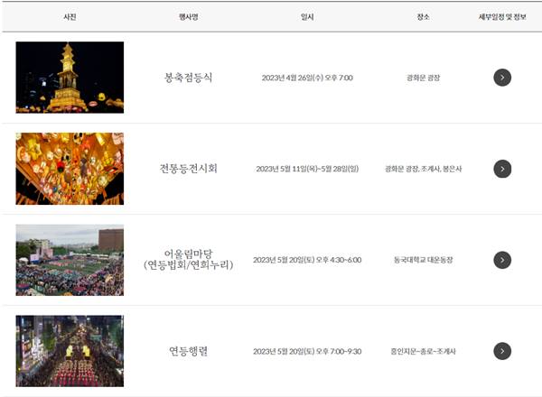 | 연등행렬 | 오후 7:00~9:30 | 흥인지문~종로~조계사 |