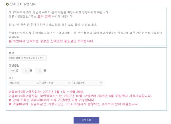 잔액조회는 에너지바우처 홈페이지에서 간단하게 조회하실 수 있습니다. 이름과 생년월일, 주소만 입력하시면 손쉽게 확인이 가능합니다.