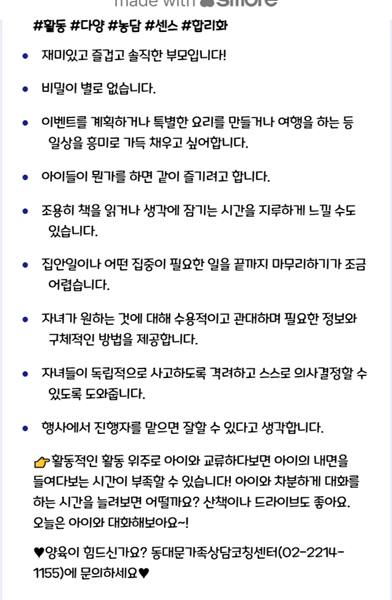몇 가지 mbti 결과를 보셨는데요. 재미있게 보셨나요? 대부분의 사람들이 원래 본인이 갖고 있던 mbti와 똑같이 나와서 놀라더라고요. 저도 너무 재미있게 했던 검사라 공유합니다. 이 검사를 통하여 부부가 함께 서로의 검사 결과를 공유하고 육아 스타일을 확인해 보는 시간을 가져보시는 것도 좋을 것 같습니다.